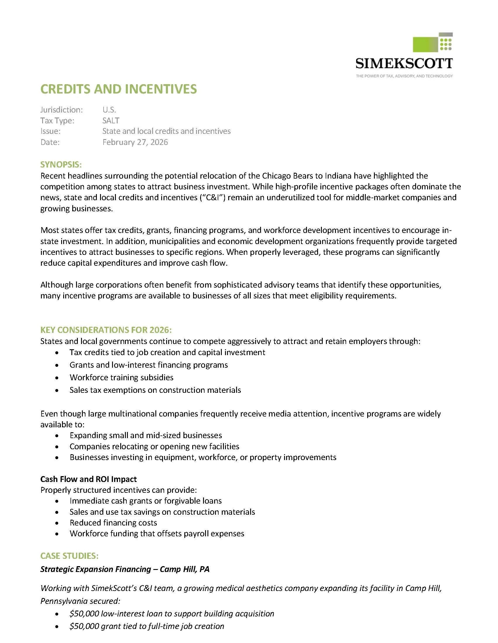 Recent headlines surrounding the potential relocation of the Chicago Bears to Indiana have highlighted the competition among states to attract business investment. While high-profile incentive packages often dominate the news, state and local credits and incentives (“C&I”) remain an underutilized tool for middle-market companies and growing businesses.