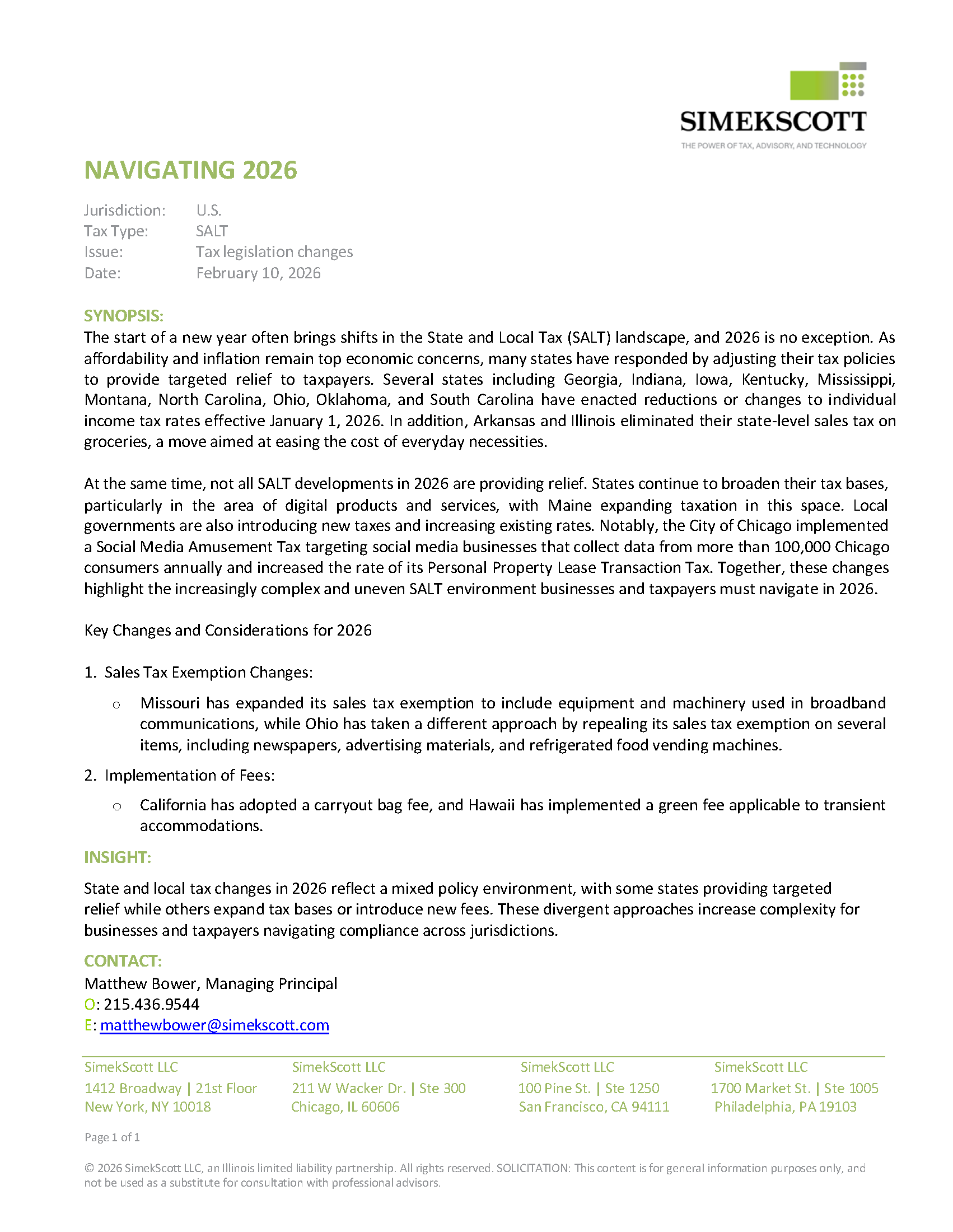 Recent changes include individual income tax reductions in several states, the elimination of grocery sales taxes in Arkansas and Illinois, and new exemptions aimed at encouraging investment and infrastructure growth. At the same time, expanded taxation of digital products, new environmental and usage-based fees, and higher local taxes—such as Chicago’s new Social Media Amusement Tax—are adding complexity to an already uneven SALT landscape. Together, these developments underscore the need for businesses and taxpayers to stay informed and adaptable in 2026.